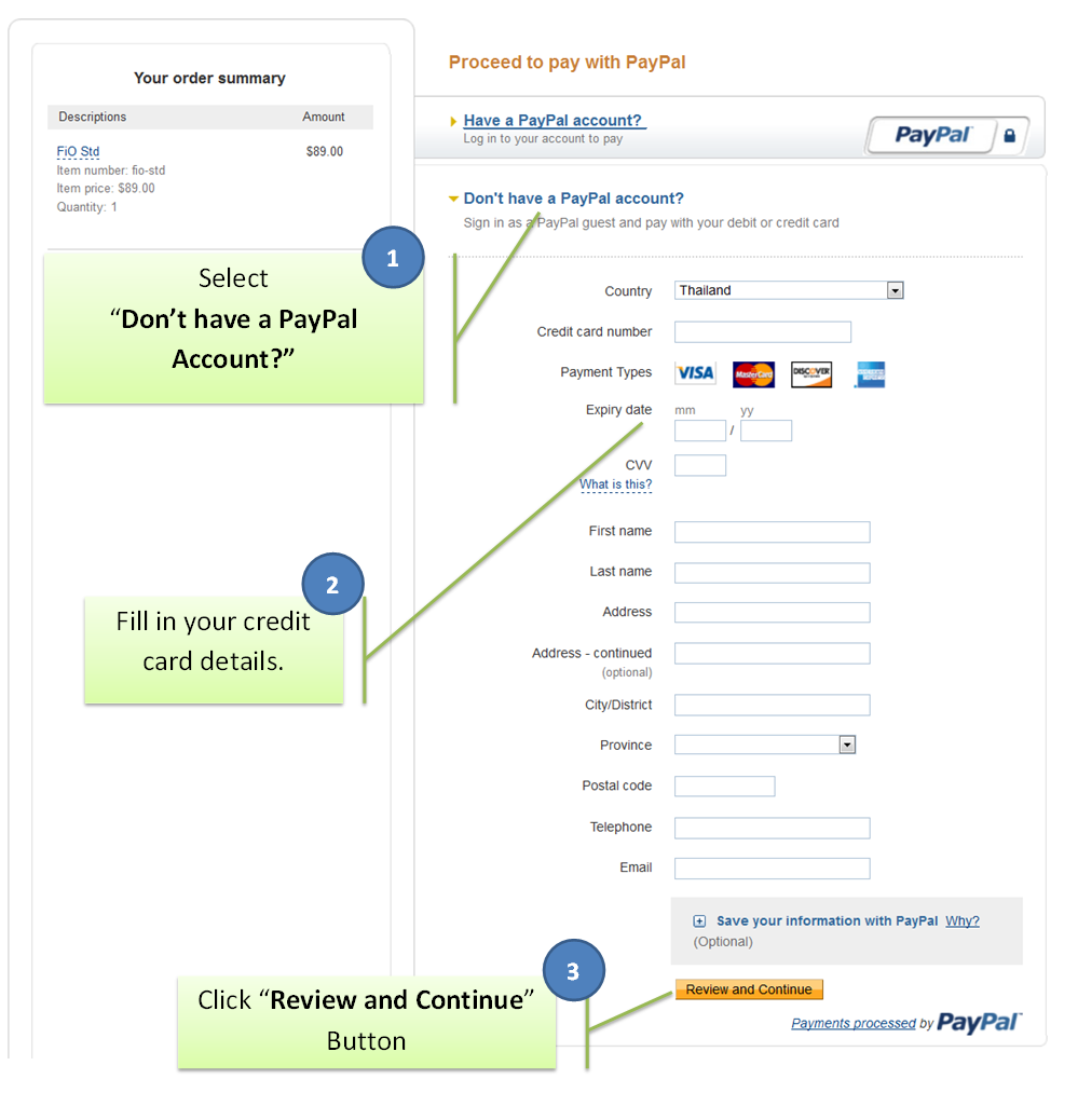 To make a credit card payment, select Pay Pal as Payment Method. You will be re-directed to Pay Pal website. Then select "Don't have a PayPal account?". Fill in your credit card details and proceed as shown to the right.